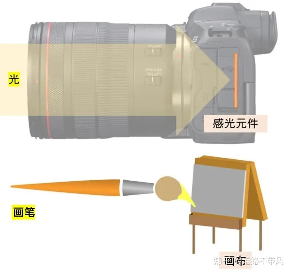 如上图所示,相机曝光过程其实就跟绘画过程一样,光线就好似画笔上的颜料,感光元件则类似于画纸。当今天光线越强,就好像画笔的颜料越多,轻轻一抹就有颜色;而光线越弱就好比颜料越少,如果只是简单一抹只会让颜色黯淡无光。