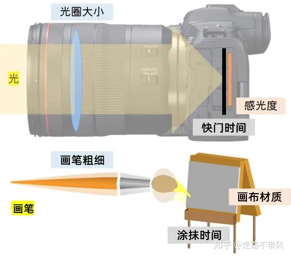 不知道这样的解释大家看懂了吗?没错,曝光三要素正是光圈、快门、感光度(ISO),而这三者对曝光的影响,就犹如画笔粗细、上色时间、画纸材质对绘画的重要性一样。因此接下来的篇章,走路不带风将会分别介绍这三大关键要素的详细内容。