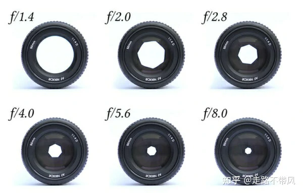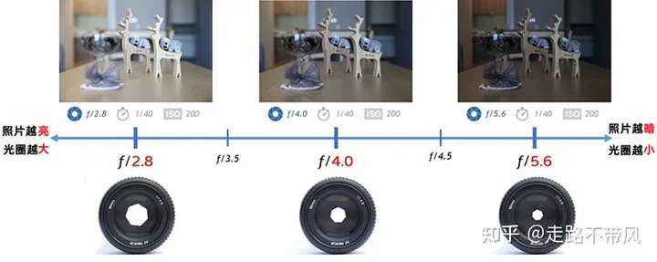 - 光圈越小 → 开孔越小 → 进光量越小 → 照片越暗