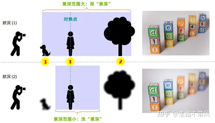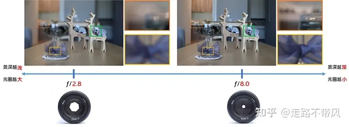 既然已经知道景深的定义了,那么光圈大小又会对景深产生什么影响呢?大家可以从下图直接看出结论。