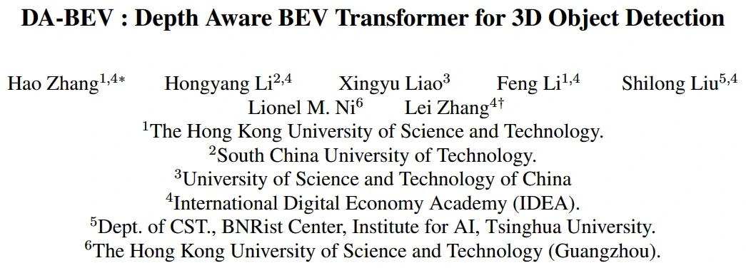 本文提出了一种隐式深度学习方法 DA-BEV,这是一种以环视图像作为输入,在 BEV 视角下利用 Transformer 进行 3D 目标检测的方法。该方法包括两个关键部分:深度感知空间交叉注意力 (Depth-Aware Spatial Cross-Attention, DA-SCA)模块和深度对比学习 (Depth-wise Contrastive Learning, DCL)。DA-SCA 模块负责将深度信息融合至 BEV 特征中,以至于能更好地捕捉目标的深度信息。而 DCL 则通过对正负 BEV 特征进行采样,进一步增强了 BEV 特征的深度感知能力。实验结果表明,DA-BEV 方法在 nuScenes 数据集上取得了 SOTA 检测性能。