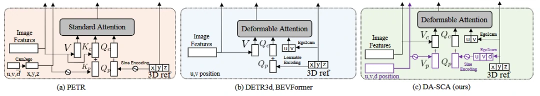 在 DA-SCA中,通过将深度信息包含在位置编码中,将每个像素的深度与其位置信息一起编码。具体地,DA-SCA 采用了可变形注意力机制,使得查询点和值点可以自适应地调整形状,从而更好地适应不同的物体形状。此外,由于 DA-SCA 中的每个查询点都有自己的深度编码,因此可以更好地区分具有不同深度的像素,从而使深度信息更好地融入到空间交叉注意力中。