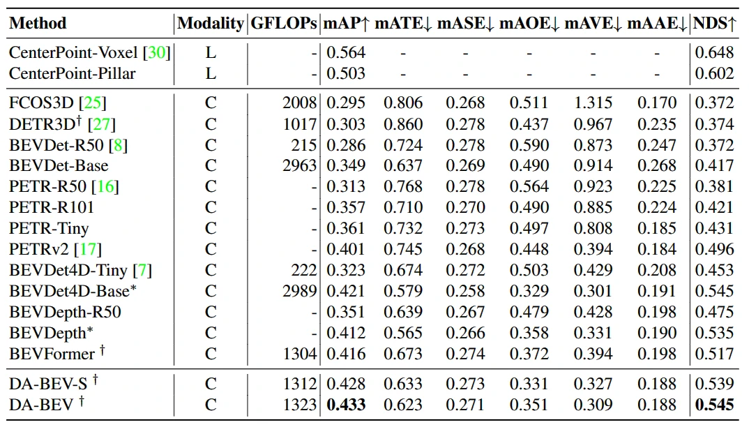 - 虽然 BEVDet4D-Based 模型的 NDS 与 DA-BEV 相同,但 GFLOPS 要高得多,并且mAP 低于 DA-BEV。