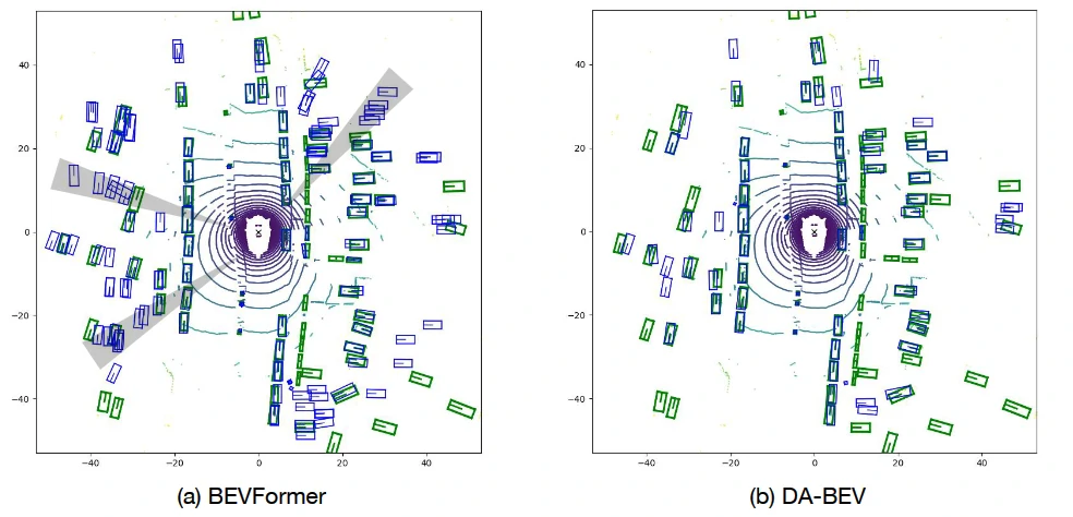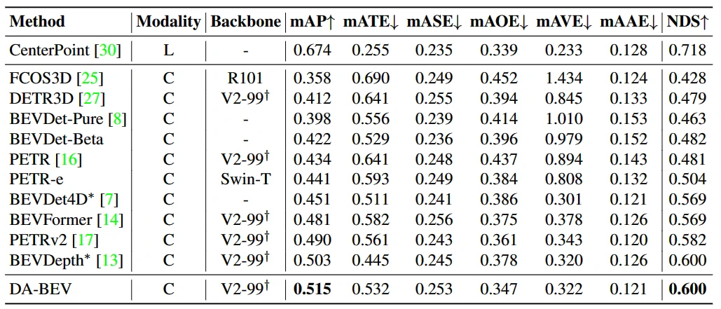 - DA-BEV 的 mAP 比之前的最优模型 BEVDepth 高1.2个点。