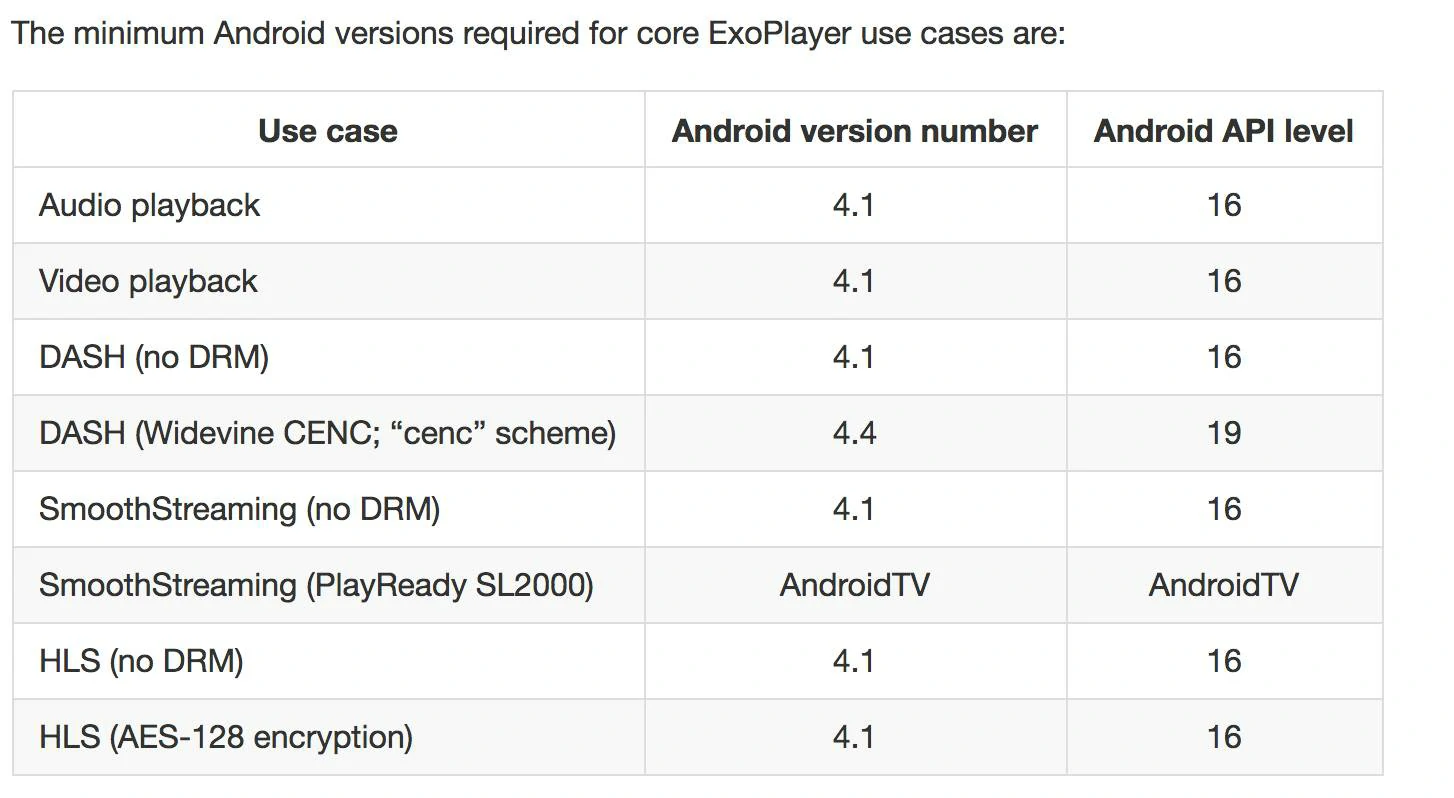 ExoPlayer:提供了更好的扩展性和定制能力,并加入了对DASH和HLS等直播协议的支持,但也只支持硬码,如果项目中只需要支持对H264格式的视频播放,以及流媒体协议比较常规(比如HTTP,HLS),基于ExoPlayer定制也是不错的选择。