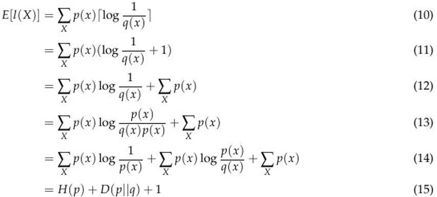 可以看到,只要执行减法操作 (15)-(9),就能得到两个期望长度之间的差为 D(p||q)。因为散度是非负的,所以这就是编码该信息平均所需的额外比特。