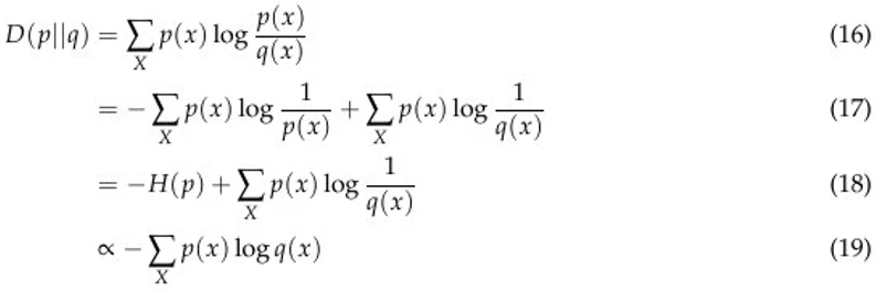 从 (18) 到 (19),我们丢弃了 -H(p),因为这是一个常数。可以看到,如果我们最小化等式左侧,我们就是在分布 p 上最大化 log q(x) 的期望。因此,最小化 LHS 即是最大化 RHS,即最大化数据的对数似然。