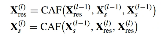 在H - CAF模块中,其中一个CAF接收来自一个分支的特征作为输入,并使用来自另一个分支的特征作为键和值。相反,另一个CAF将上一个CAF收到的输入作为key和value,而将上一个CAF的key和value作为当前的输入。两个CAFs构成一层H - CAF,其具体形式如下: