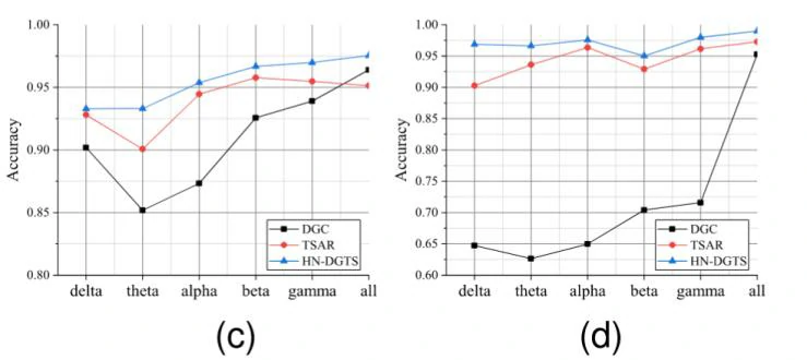 SEED-IV数据集:在θ频段上,HN-DGTS模型的平均分类准确率达到98.97%。模型在中性和悲伤情感的分类上表现最佳,准确率分别为95.24%和98.48%。
