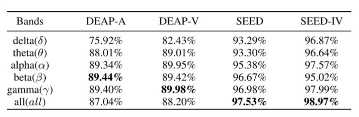 DEAP数据集:在唤醒度维度上,β频段的分类准确率最高,达到89.44%;在效价维度上,γ频段的分类准确率最高,达到89.98%。总体来看,效价维度的分类准确率高于唤醒度维度,这与先前的研究结果一致,表明效价对情感刺激更为敏感。