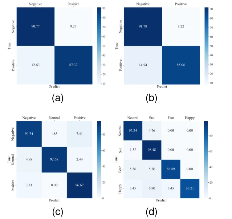 通过混淆矩阵的可视化,可以直观地评估模型在不同情感类别上的分类性能。本文提出的HN-DGTS模型在DEAP、SEED和SEED-IV数据集上均表现出色,尤其是在识别低唤醒度、低效价、积极、中性和悲伤情感时。这些结果进一步验证了模型在EEG情感识别任务中的有效性和鲁棒性。
