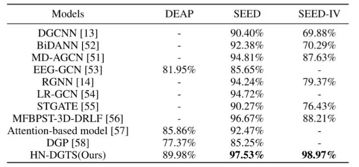 本文通过在三个公开的EEG情感识别数据集(DEAP、SEED和SEED-IV)上进行实验,验证了所提出的混合网络(HN-DGTS)模型的有效性。