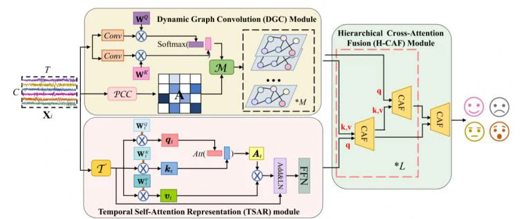 本文提出了一种基于动态图卷积(Dynamic Graph Convolution, DGC)和时间自注意力表示(Temporal Self-Attention Representation, TSAR)的混合网络(Hybrid Network, HN-DGTS),用于基于EEG的情感识别。该方法的核心在于同时提取EEG信号的空间和时间特征,并通过层次交叉注意力融合(Hierarchical Cross-Attention Fusion, H-CAF)模块进行特征融合,以提高情感识别的准确性。