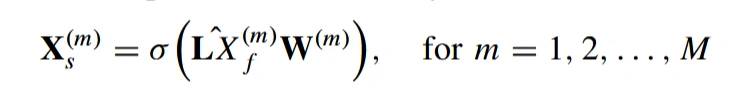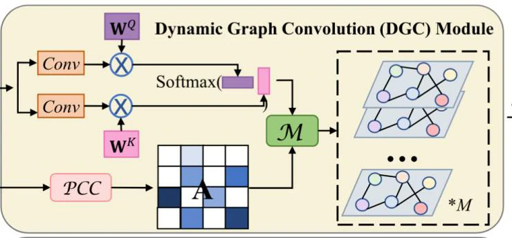 给定一个拉普拉斯矩阵L (和特征矩阵Xf),在DGC模块中,DGC作用于每个脑图的节点以捕获空间特征,然后通过堆栈构建多个卷积层。在M层DGC中,第m层的图卷积操作可以定义为