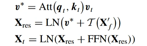 给定所有通道的典型得分矩阵Att,将每个值与可用信息进行聚合以更新自身。为了解决梯度消失问题,加入了残差连接。此外,将自注意力与包含两个全连接层和ReLU激活函数层的前馈网络( FFN )相结合。这种结合允许进一步提取时序特征,增强了模型的非线性学习能力。最终得到的时序特征Xt,其大小与输入相同,形状为[N,D,C]。过程定义如下: