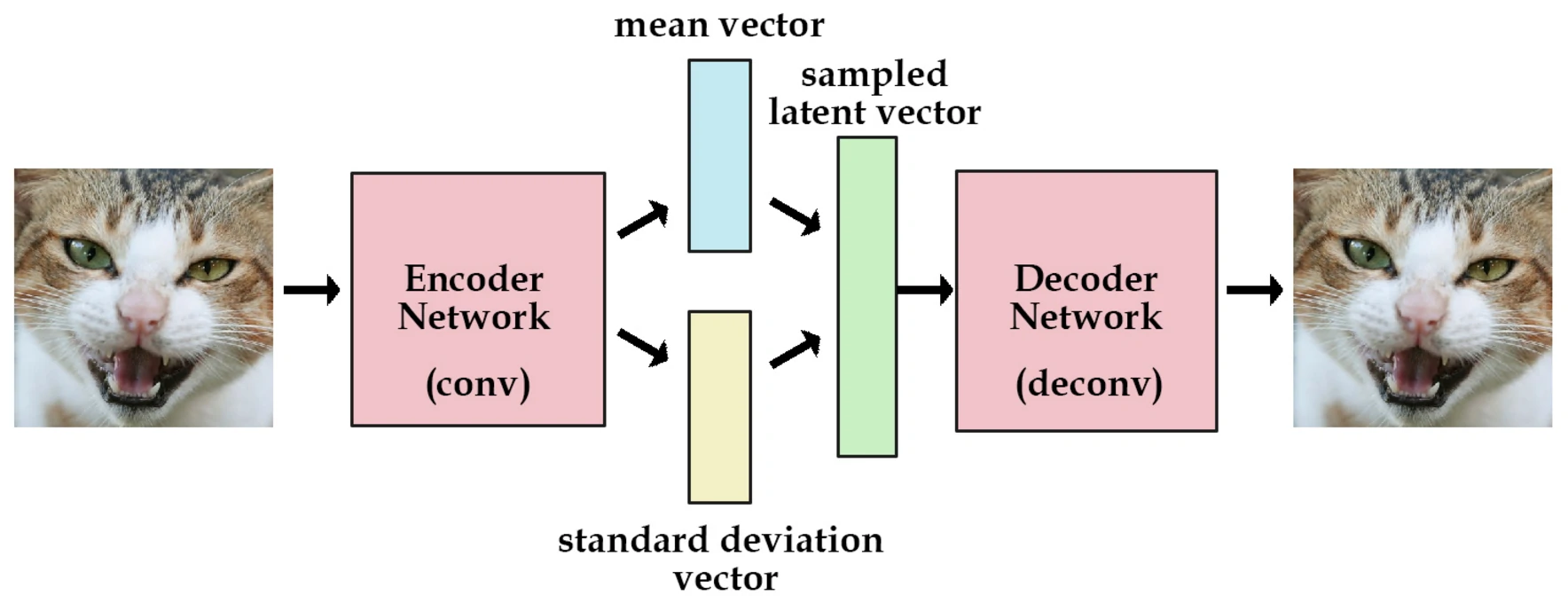 但是,这样的向量很稀疏。为了解决这个问题,我们想使用实数值向量而不是0,1向量。我们可认为这种实数值向量是原图片的一种编码,这也就引出了编码/解码的概念。举个例子,[3.3, 4.5, 2.1, 9.8]代表猫,[3.4, 2.1, 6.7, 4.2] 代表狗。这个已知的初始向量可以作为我们的潜在变量。