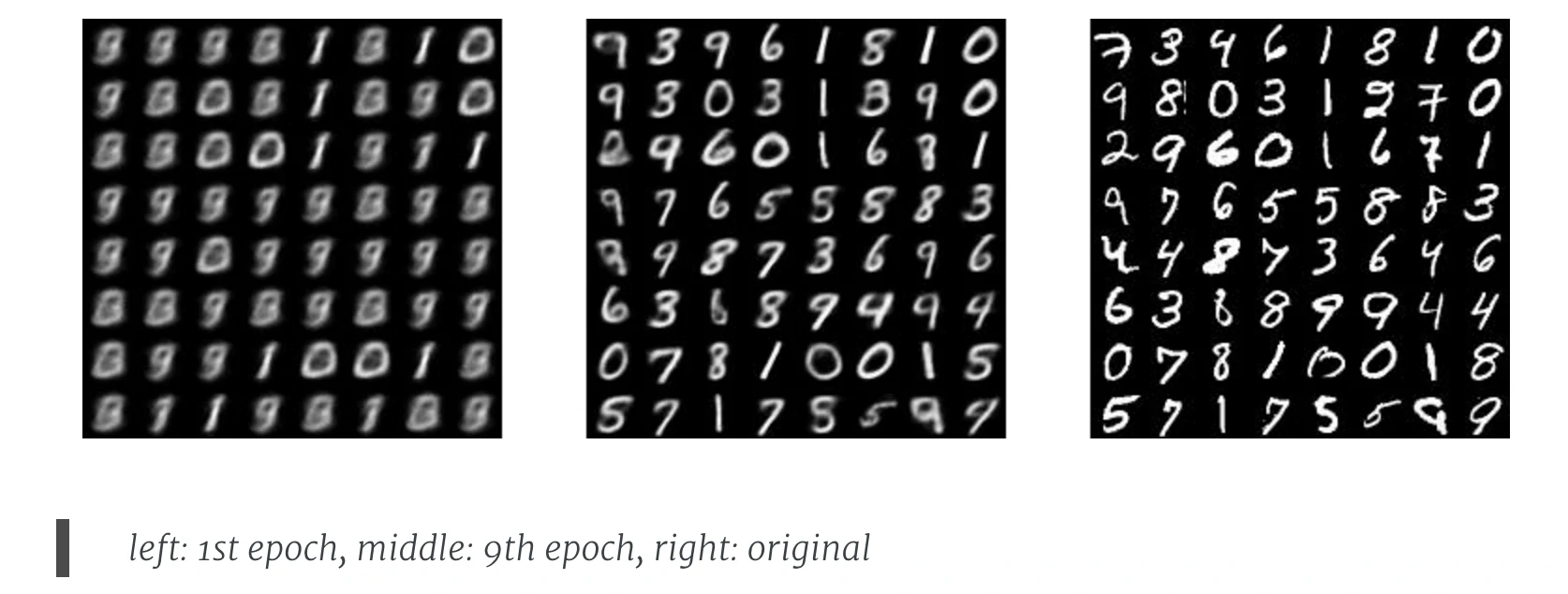 现在,产生新的图片也变得容易:我们只要从单位高斯分布中进行采样,然后把它传给解码器就可以了。