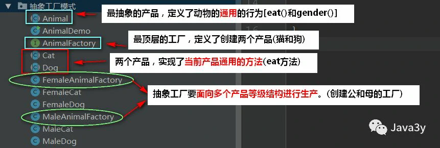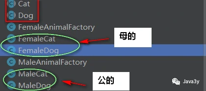 - 所以MaleAnimalFactory定义了**createDog()和createCat()**生产公狗和共猫