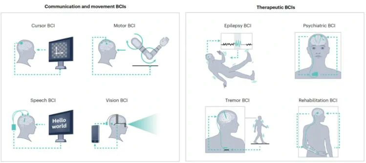 这些设备主要用于通过改变大脑活动来治疗疾病。比如,癫痫BCI可以帮助控制癫痫发作,精神BCI可以用于治疗抑郁症等精神疾病,康复BCI则可以帮助大脑功能恢复。这一类还包括一些传统技术,比如深脑刺激器,但前提是这些设备需要通过电子设备的计算来工作。如果是简单的、没有计算步骤的设备(比如传统的“开环”神经调节设备),则不算在内。