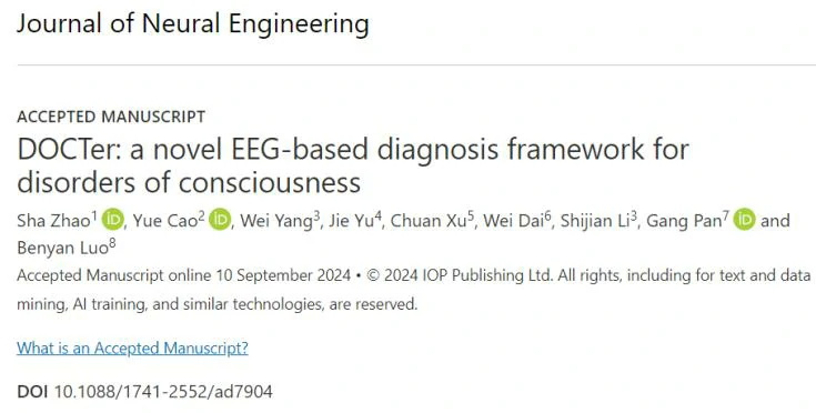 该论文发表于Journal of Neural Engineering,题目为《DOCTer: a novel EEG-based diagnosis framework for disorders of consciousness》。浙江大学的赵莎特聘研究员为此文的第一作者,浙江大学脑机智能全国重点实验室主任潘纲教授、浙江大学附属第一医院的罗本燕主任为此文的通讯作者。