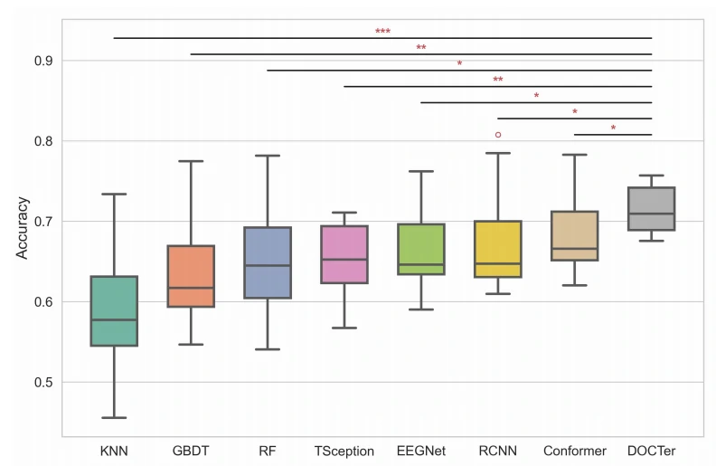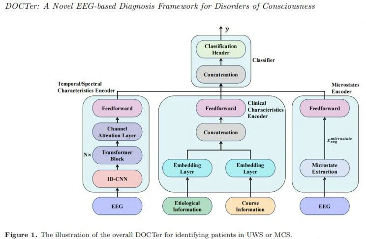 DOCTer框架通过深度学习技术,从原始EEG信号中提取出多种关键特征,包括时间-频率特征和微状态特征,并结合患者的临床特征信息进行综合分析,实现对MCS和UWS的准确区分。为了验证DOCTer的有效性,研究团队收集了一个包含409个静息状态EEG记录的大规模数据集,其中包括128例UWS和187例MCS患者的数据。研究结果显示,DOCTer在该数据集上表现出比其他现有方法更高的诊断准确性,尤其是时间/频谱特征在诊断任务中起到了关键作用,这为临床实践带来了新的希望,有望帮助医疗人员更准确地评估和治疗意识障碍患者。