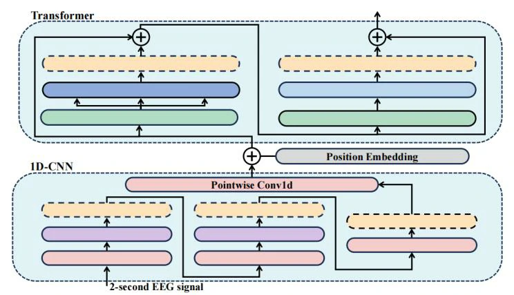 研究表明不同意识水平的患者在EEG的时间和频率域上存在显著差异,因此本文设计了一个CNN-Transformer编码器,用于对EEG记录中的时间和频谱特征进行编码,从而同时捕捉短期和长期特征,这种方法可以更全面地理解EEG信号,提高对意识障碍患者的识别准确性。如图2所示,CNN模块由三个连续的卷积块组成,应用一维卷积来提取特征;将最后一层CNN的输出输入到标准Transformer编码层,对特征向量应用通道注意力机制,学习每个通道位置的权重,从而使模型能够自动加权不同通道的特征表示,以进一步捕捉EEG记录的全局特征。
