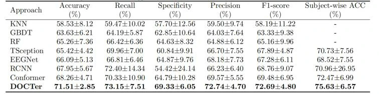 为了评估本文方法的有效性,本文将其与其他方法(包括传统机器学习方法和深度学习方法)在相同数据集上进行了比较。性能比较结果见表1和图4。本文的DOCTer在区分MCS和UWS方面优于其他方法,准确率为71.51%,召回率为73.15%,F1值为72.69%,受试者准确率为75.63%,且标准差也是DOCTer值最低,表现最稳定。这表明本文采用结合时间/频谱特征、微状态和临床特征这种方式对任务非常有效。