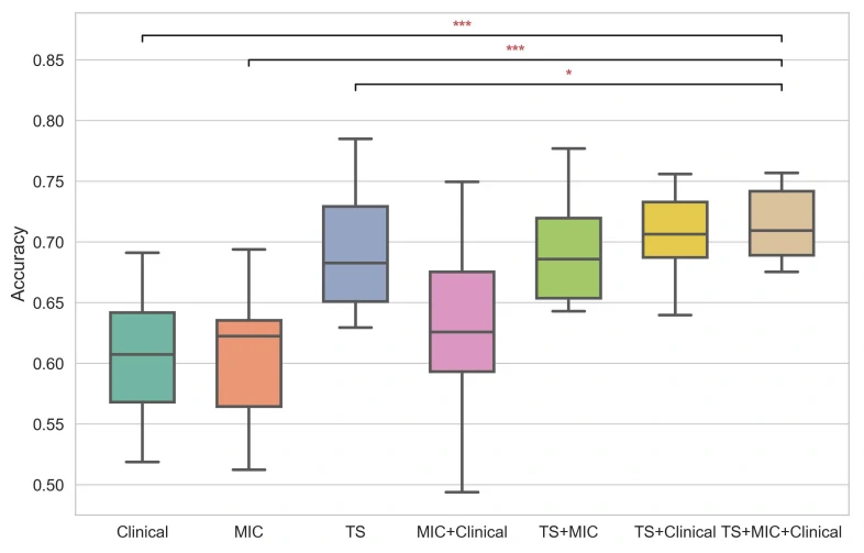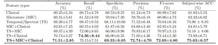 本实验中研究了不同特征类型对任务的重要性,包括时间/频谱特征、微状态、临床特征及其组合。表2显示了不同特征类型的平均值和标准差,图5则通过箱线图详细展示了结果分布,均表明不同特征类型的组合有助于提高诊断准确性。