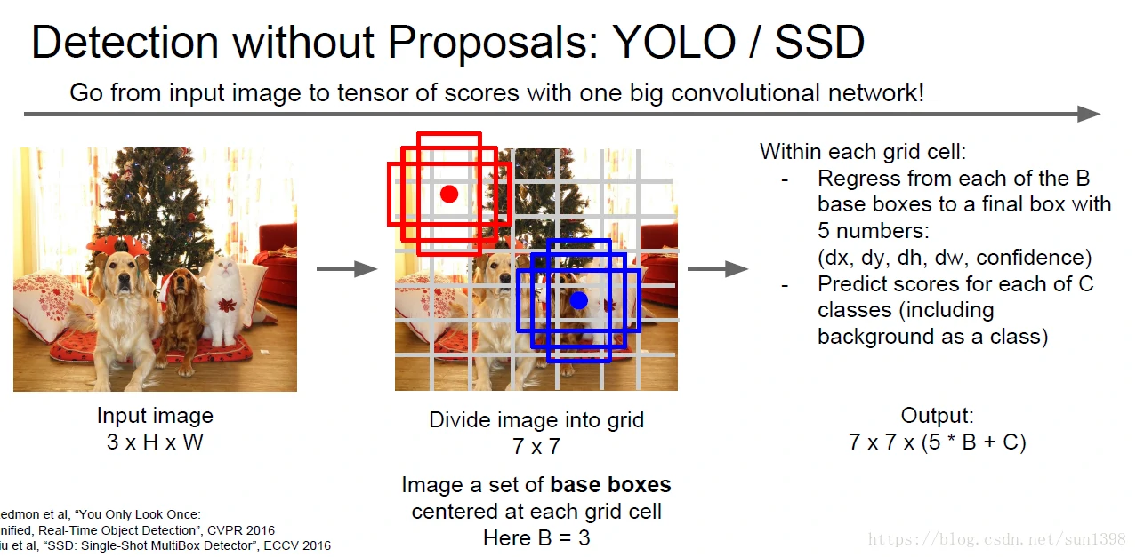 当然以上的方法还是做不到实时处理,提出了只看一次算法,将图片等分成N块,输出除了包括边界,还增加了一个置信概率,概率最大区域为中心,通过扩大旁边不同的区域,最终实现目标的识别。