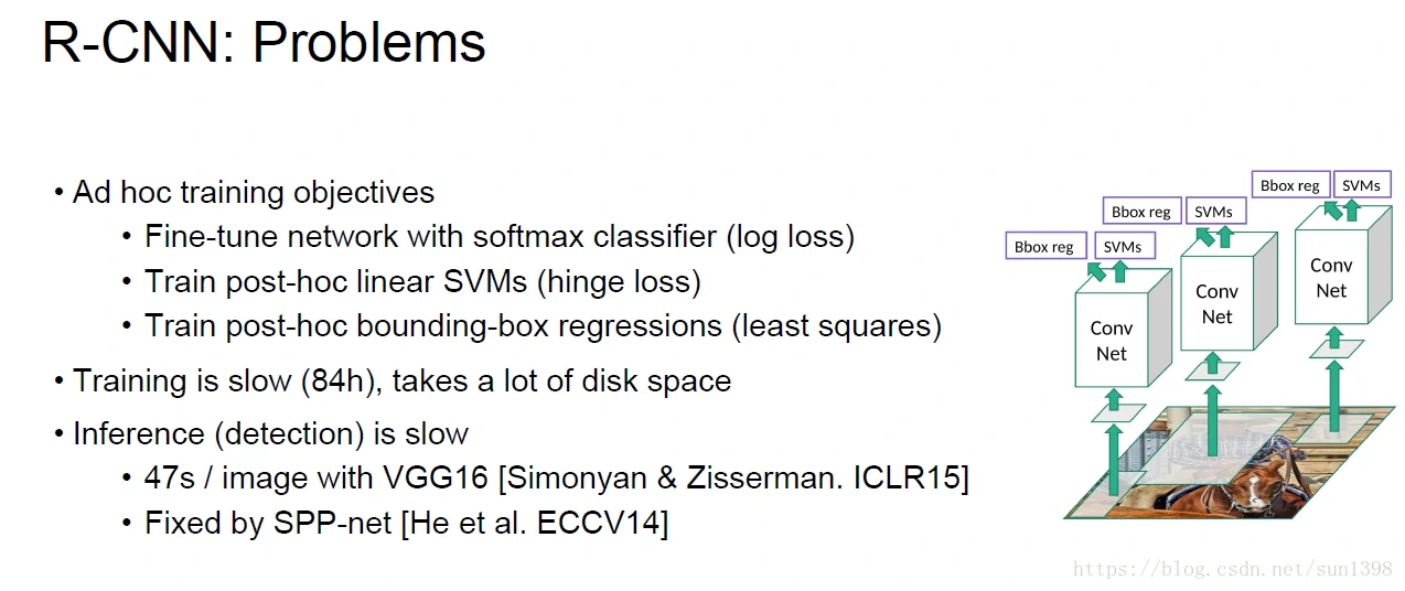 - 改善点2:增加Rol池化层,降低数据量,使用softmax替代SVM。