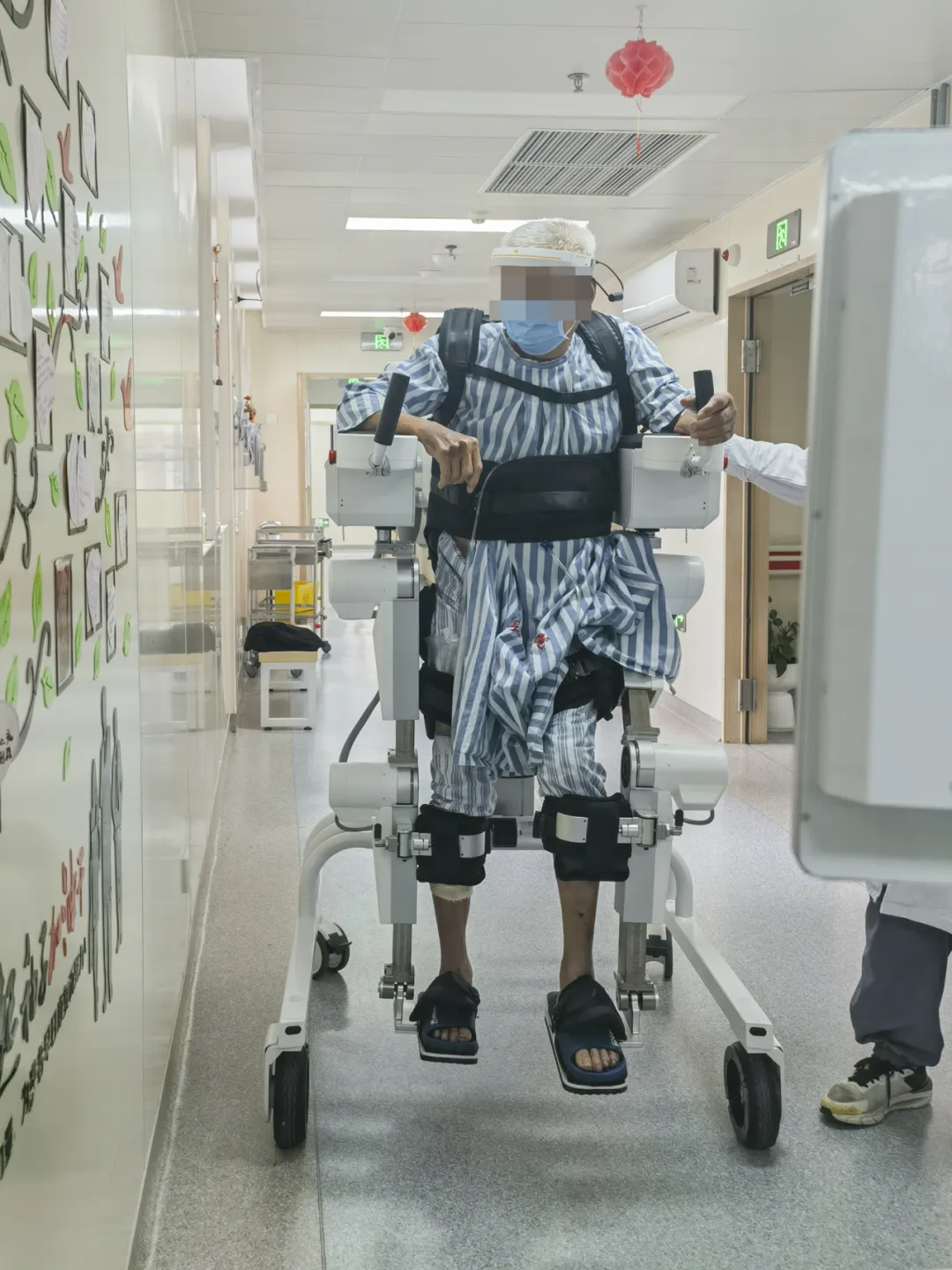近日,73岁的脑梗死患者郑伯在我院脑机接口病房成功迈出了康复治疗后的第一步。郑伯因言语含糊、行走不稳入院,经诊断为进展性脑梗死合并急性大血管闭塞。尽管及时开展了介入取栓手术,仍遗留一侧肢体功能障碍。术后第5天,他在脑机接口病房佩戴了脑控下肢康复机器人后,仅通过集中意念想象行走,设备便驱动其右腿迈步。“机器明白我的心思,我一想腿脚就动了!”他激动地说道。