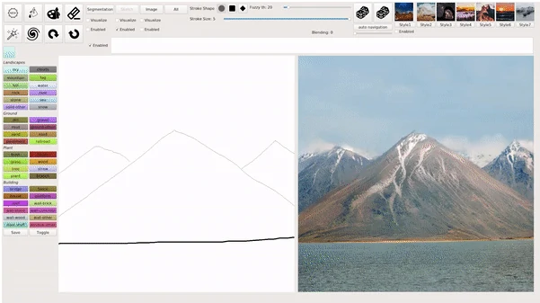 只需勾勒出山脉的线条,AI就会生成完整的山脉,并且补充天空、云彩和江河等元素。