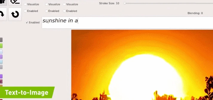 这个生成模式是GauGAN2的重大创新,在文本框添加的每一个单词信息,都会在AI创建的图像中得到呈现。例如在下图中,从sunshine,到a tall tree 最后再到sunshine in a tall tree forest,生成的图像一直在随着文本的丰富而发生变化。