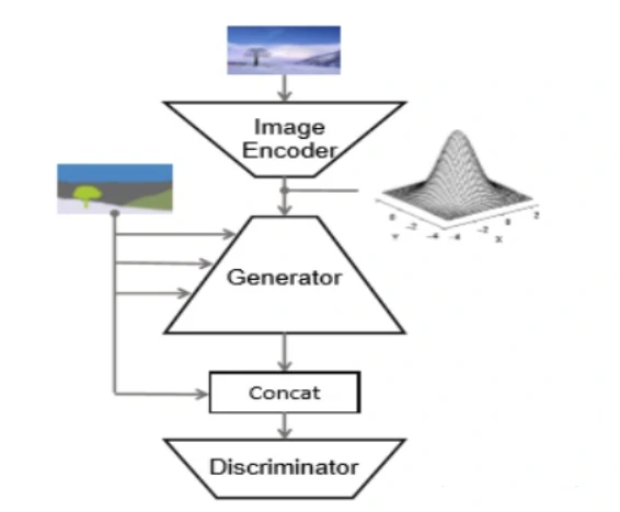 GauGAN2建立在生成对抗网络(GAN)的基础上,由生成器和鉴别器组成。生成器的目标是生成逼真的图像。例如获取与文本匹配的图像,并预测可能与图片中元素对应的数据(例如图2中的山脉、雨天),使得鉴别器不能将合成图像与真实图像区分开。GAN的转换质量会随着鉴别器的反馈而不断提高。