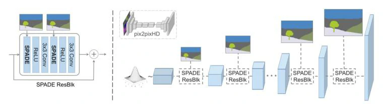在生成器中构建了一个模块SPADE ResBlk,SPADE可以更好地保护语义信息不受常见归一化层的影响。使用SPADE不需要将分割图提供给生成器的第一层,因为学习的调制参数已经编码了关于标签布局的足够信息。