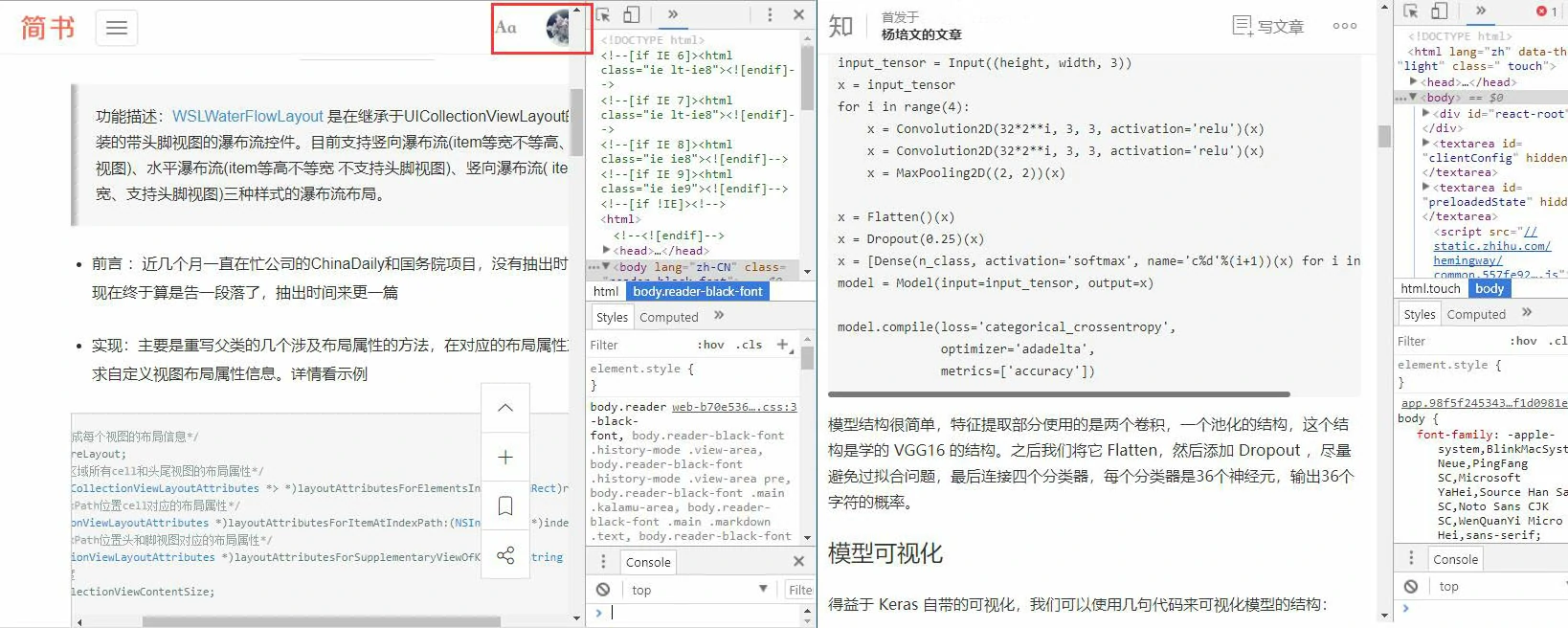 - 技术上,简书应该是使用了vue,知乎是完全react来构建的,响应式布局上知乎也是完全无缝对接,从下图就可见一斑,简书在界面变小的时候出现了下图中的问题,但是知乎没有