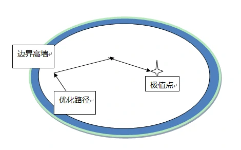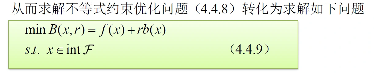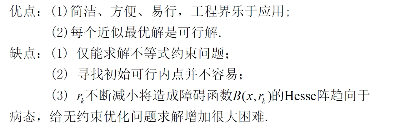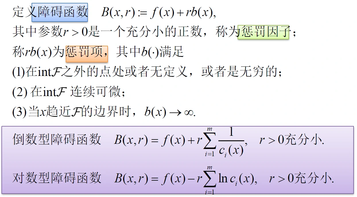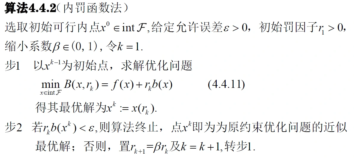 相比于外罚函数法在不可行区域加惩罚,内罚函数法在可行域边界筑起高墙,让目标函数无法穿过,就把目标函数挡在可行域内了。