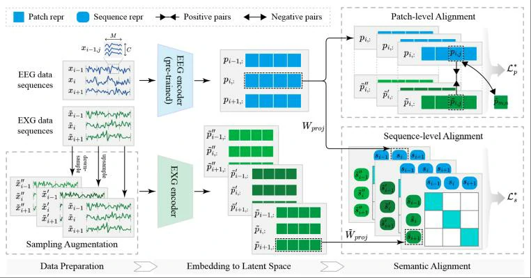 通过EEG和EXG编码器,从原始的生理信号中提取关键特征,如图2中间部分所示,这些特征能够捕捉信号的重要属性和模式。将高维的生理信号数据转换为低维的潜在空间表示,这有助于减少数据的复杂性,同时保留最重要的信息,也为后续的片段级对齐和序列级对齐提供基础。