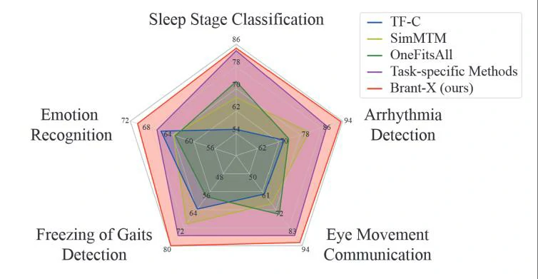Brant-X是一个新提出的生理信号对齐框架,旨在通过建模脑电图(EEG)与其他生理信号(如眼电图EOG、心电图ECG和肌电图EMG,统称为EXG)之间的相关性,提升多种健康监测和疾病诊断场景下的性能。Brant-X利用预训练的EEG基础模型和两级对齐策略,实现了从EEG到其他生理信号的数据高效知识转移。在睡眠阶段分类、情绪识别等多个下游任务中,Brant-X展现了卓越的性能,超越了现有的任务特定和任务无关的基线方法。