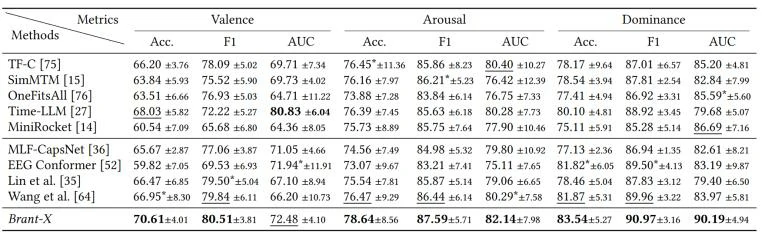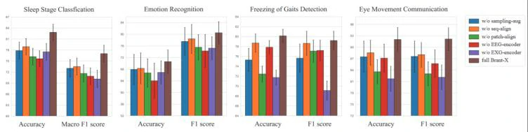 大量实验表明,Brant-X在涉及EEG和EXG信号的不同场景中的各种下游任务上实现了SOTA性能,如图3所示,这说明了本文的框架在各种场景中的有效性。