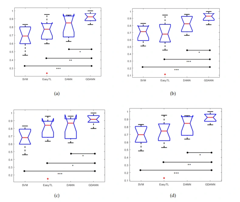 为了验证方法的有效性,作者将其性能与SVM和EasyTL进行比较。SVM是最常见、最高效的有监督机器学习方法,可以用来突出迁移学习的强大性能。EasyTL是另一种有用的迁移学习方法,可用于将性能与GDANN进行比较。这里需要注意的是,在比较的过程中,EasyTL与GDANN有相同的训练集和测试集,而SVM不需要无标签数据的辅助训练,而是来自的训练集和来自的测试集。我们可以得到混淆矩阵对应的箱线图,以及它们配对的t检验的结果,如图7所示。通过比较这四个指标,可以看出我们的模型GDANN比其他三个模型有更好的表现。比如在准确率方面,改进后的模型GDANN平均准确率达到了91.63%,相比原始模型DANN有11.9%的性能提升,而EasyTL平均准确率为72.95%,SVM为67.77%,体现了GDANN 的良好表现。