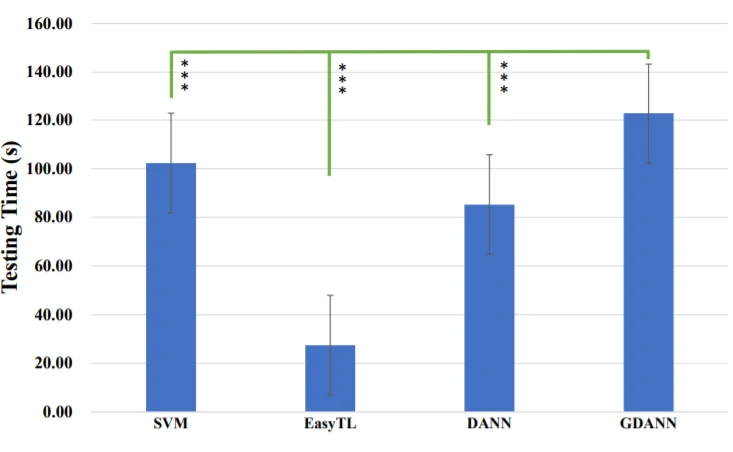 此外,作者也比较了四种模型的测试时间如图8。该图比较了相应模型所需的平均测试时间,带有正负偏差误差线。可以看出,GDANN(122.80 s)比SVM(102.3 s)、EasyTL(27.44 s)和DANN(85.24 s)花费的时间更多。