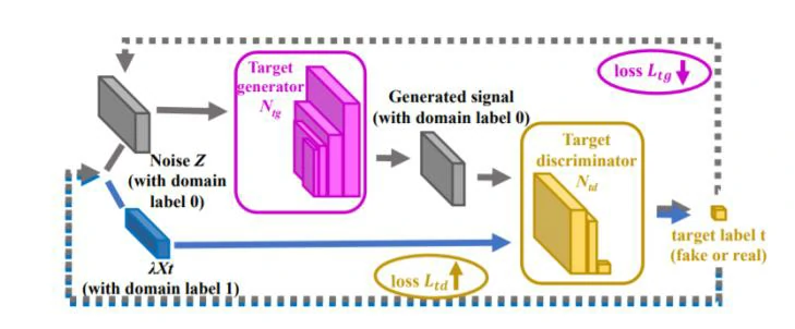 该文在现有的DANN()基础上添加了GAN,其中,GAN由生成带有参数和损失值的假目标域数据的生成网络(如图1)和用于识别真实目标域数据和虚假目标域数据的分类网络(如图2)组成。各个损失函数分别为。
