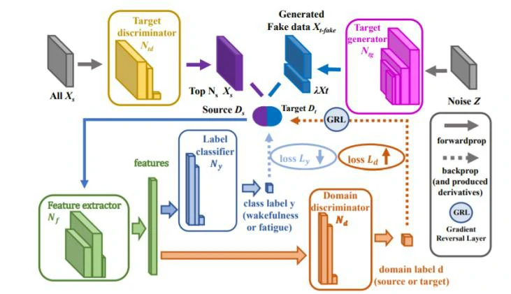 精神疲劳是一种复杂的生理和心理状态,可导致警觉性、注意力和认知能力下降。全球每年约有130万人在交通事故中丧生,疲劳驾驶是其中的主导因素。因此,在驾驶时进行精神状态检测和预测对于减少疲劳驾驶造成的生命财产损失极为重要。目前已经有了很多疲劳检测的方法,它们可以分为三类:心理测量问卷、行为方法(例如,面部表情、头部运动、眨眼率和眼睛状态)和生理测量(EEG、心电图 (electrocardiogram, ECG)、眼电图 (electrooculogram, EOG) 和表面肌电图)。这些问卷,不仅主观性强,而且无法实时监测疲劳状态,而行为方法极易受到道路环境的干扰,造成一定的判断误差。在生理测量中,EEG 被认为是最有效的精神状态检测方法,因为 EEG 记录了人类大脑皮层神经细胞活动,可以直接反映大脑的即时状态,避免人为主观因素的影响。大多数现有的基于EEG的疲劳驾驶检测方法都集中在提取合适的特征和设计分类器上,这种方法虽然有效,但主要集中在同一被试情况下的脑电分析,这意味着跨被试检测能力仍然不足。如今,基于领域自适应方法的迁移学习模型被广泛应用于自然语言处理和图像分类等许多领域,并有着非常好的性能。DANN是一种典型的领域自适应方法,其最重要的特点是在没有标记目标样本的情况下对齐源域和目标域。它在跨被试的 EEG 分析中仍然存在一些缺点。首先,DANN要求源域和目标域之间的样本是平衡的,而对于跨被试EEG分析,源域中的样本通常远大于目标域中的样本,表现出严重的不平衡。其次,由于跨被试的EEG信号存在显著差异,一些源域样本可能与目标域的分布极为不一致,这将导致“负迁移”,并使DANN在跨域中的性能下降。