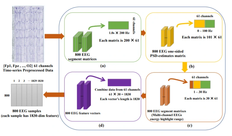 脑电图由数字监测系统(Brain Products GmbH,Munich,Germany)记录,采样频率为200 Hz。所有EEG通道的阻抗保持在10 KΩ以下。之后,使用带通滤波器将 EEG 数据保持在1 Hz和30 Hz之间,并采用独立分量分析(ICA)去除由眨眼引起的伪影。去除伪影后,应用具有10%重叠的1 s滑动窗口将EEG信号分割成61个通道,并为每个对象获取每种条件的400个片段。然后,选择在0.1Hz到30 Hz的频率范围的功率谱密度 (PSD) 将三维时间序列片段转换为二维样本数据。PSD的详细示意图如图5所示。