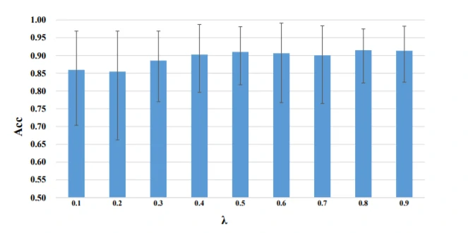 为了获得稳定的性能,作者对参数λ和进行调整。当优化一个参数时,另一个参数保持不变,来观察它们的敏感性。这两个参数值由以下两个范围确定,分别是:{0.1, 0.2, 0.3, 0.4, 0.5, 0.6, 0.7, 0.8, 0.9} λ和{1, 2, 3, 4, 5, 6 , 7, 8, 9, 10, 11, 12}为Ns。结果如图6,7所示: