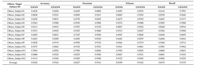 为了体现所提模型的改进,作者首先比较了GDANN和DANN的性能,然后利用上面得到的最优参数,对其Accuracy、Precision、F1Score、Recall等相关指标的性能进行了分析。在实验中,PSD被提取为训练 GDANN 和 DANN 的输入。相同的训练集和测试集分别用于训练和测试。表1显示了重复实验5次后的平均结果。