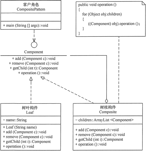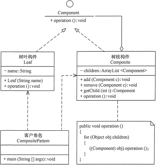 class Leaf implements Component { private String name; public Leaf(String name) { this.name = name; } public void add(Component c) { } public void remove(Component c) { } public Component getChild(int i) { return null; } public void operation() { System.out.println("树叶" + name + ":被访问!"); } }