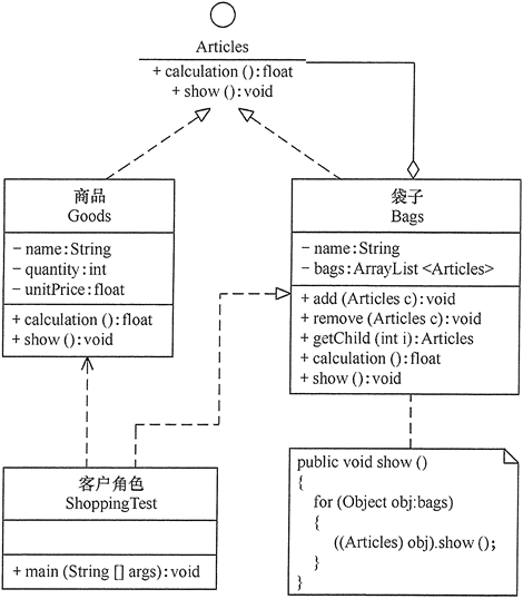class Bags implements Articles { private String name; private ArrayList<Articles> bags = new ArrayList<Articles>(); public Bags(String name) { this.name = name; } public void add(Articles c) { bags.add(c); } public void remove(Articles c) { bags.remove(c); } public Articles getChild(int i) { return bags.get(i); } public float calculation() { float s = 0; for (Object obj : bags) { s += ((Articles) obj).calculation(); } return s; } public void show() { for (Object obj : bags) { ((Articles) obj).show(); } } }