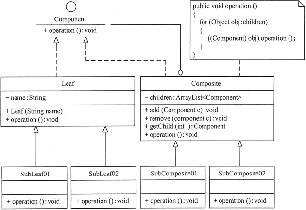 | public class CompositePattern { public static void main(String[] args) { Component c0 = new Composite(); Component c1 = new Composite(); Component leaf1 = new Leaf("1"); Component leaf2 = new Leaf("2"); Component leaf3 = new Leaf("3"); c0.add(leaf1); c0.add(c1); c1.add(leaf2); c1.add(leaf3); c0.operation(); } }